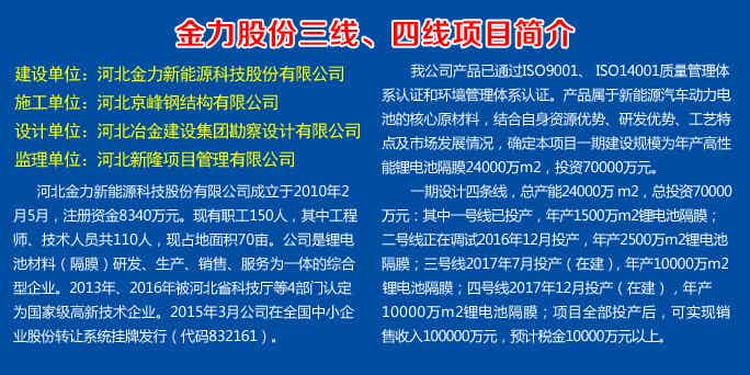 2016年11月1日,在歡慶的鞭炮聲中,我公司高性能鋰電池隔膜項目3#、4#廠房開工,年產隔膜2億平方米。該產品屬于新能源汽車動力電池的核心原材料,結合全國市場需求狀況,引進國外一流生產線。它的建設為金力股份實現跨越發展打下了良好的基礎。