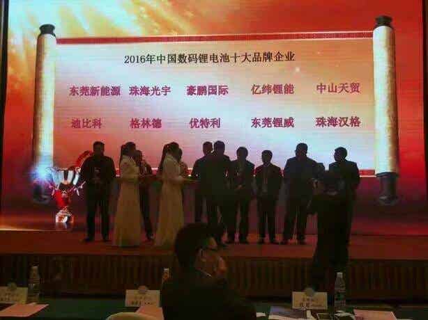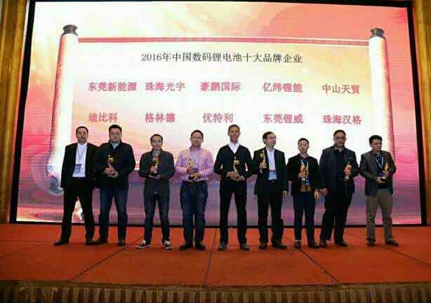 附圖1:榮獲“2016年中國3C鋰電池十大品牌”獎(jiǎng)杯