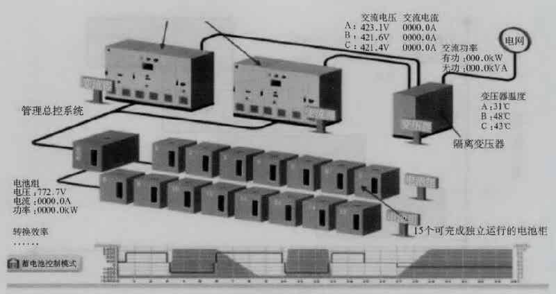 一個三單體電池構成的鋅/溴電池系統(tǒng)。電解質是溴化鋅水溶液,靠泵循環(huán)通過電極表面。電極表面被多孔塑料膜依次隔開。所以,在正、負極存在兩股電解質流。鋰電池依據(jù)不同的部件設計,兩股液流方向可以不同。兗電時鋅在負極上沉積,溴在正極上生成。放電時在各自電極上分別生成鋅離子和溴離子。電極間的微孑L隔膜阻止溴向沉積鋅一側的擴散,從而降低因直接化學反應造成的電池自放電。