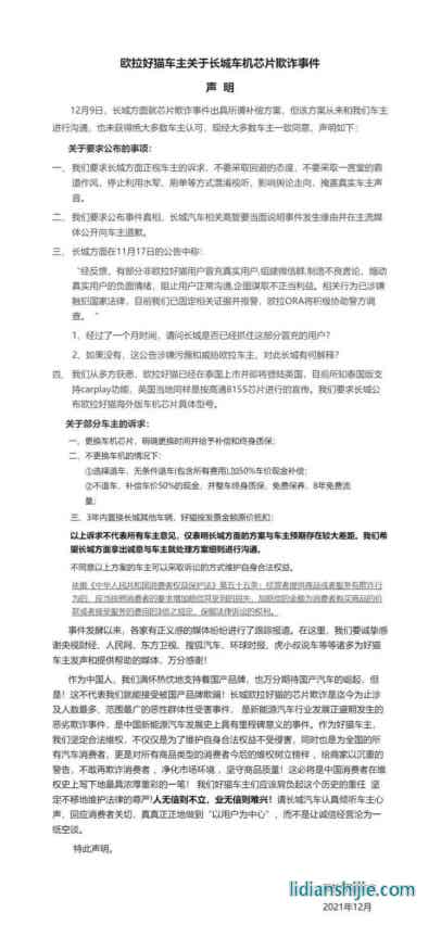 12月16日,歐拉好貓車主聯合發布維權聲明稱,長城汽車于12月9日發布的補償方案未與車主溝通,也未獲多數車主認可:
