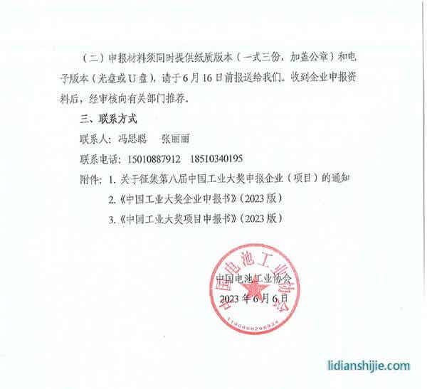 根據中國工業經濟聯合會《第八屆中國工業大獎申報工作通告》(2023年第1號)和中國輕工業聯合會《關于征集第八屆中國工業大獎申報企業(項目)的通知》(中輕聯標準〔2023〕136號)要求,中國電池工業協會將組織電池行業優秀企業(項目)進行申報和推薦,現將有關事項通知如下: