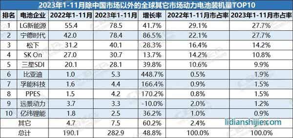 統(tǒng)計(jì)數(shù)據(jù)顯示,2023年1-11月,在除中國市場(chǎng)以外的全球其它市場(chǎng)(海外市場(chǎng)),動(dòng)力電池裝機(jī)量達(dá)282.9GWh,同比增長48.8%。