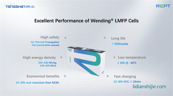 相比LFP與NCM電池,瑞浦蘭鈞推出的LMFP電池綜合了LFP電池和NCM電池的優勢性能,疊加瑞浦蘭鈞獨創的Wending®技術后,進一步提升能量密度、循環壽命、低溫性能、快充性能、安全性能等。