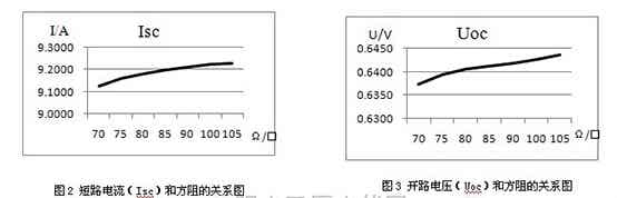 實(shí)驗(yàn)結(jié)果表明:對于高電阻率的太陽能電池片,其輸出特性短路電流Isc和開路電壓Uoc會(huì)隨著方阻的增長呈線性增長趨勢,如圖2、3所示;填充因子FF會(huì)隨著方阻的增加呈緩慢下降