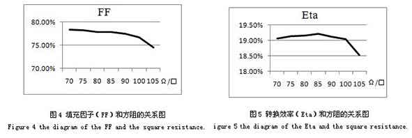 趨勢,如圖4所示;而轉(zhuǎn)換效率Eta隨著方阻的增加,開始是平緩增長,直至達(dá)到峰值后迅速降低,如圖5所示。