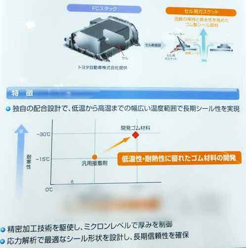 住友理工在“人與車科技展2015”(5月20~22日于太平洋橫濱國際會(huì)展中心舉行)上,首次展出了向豐田燃料電池車(FCV)“MIRAI”首次展出了向豐田燃料電池車的燃料電池用橡膠制粘合材料“電池單元用密封墊片”。