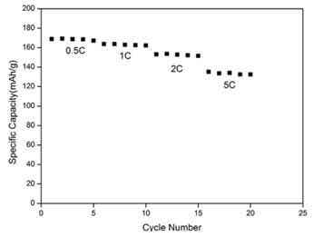 圖3是燒結條件為750?C燒結10小時,取出研磨之后再在920?C燒結10小時的條件下合成的最佳樣品LiCo0.95Mg0.02V0.03O1.98F0.02的倍率性能曲線,分別進行了0.5C,1C,2C,5C的倍率性能測試。由圖3可知,在0.5C倍率測試條件下,樣品的放電比容量較高,超過了170mAh/g,但是隨著循環的深入,材料的容量有了一定程度的下降,在較大倍率2C以及5C倍率的測試條件下,材料的放電性能較之前有所下降,但仍然有150mAh/g和130mAh/g,容量的衰減可能是由于大倍率電流下,比容量受到了鋰離子擴散系數和速度的影響,造成了極化增大的緣故。值得一提的是,隨著循環的進行,材料的放電比容量略有一定程度的上升,這是由于鋰離子電池隨著循環的進行逐步活化的過程所致。