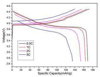圖4 為LiCo0.95Mg0.02V0.03O1.98F0.02的倍率充放電曲線