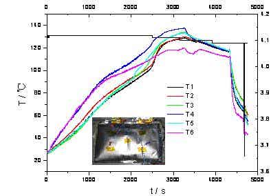 圖11為電池熱箱試驗(150℃/30min)的連接及溫度采集點位置布局圖。圖12為電池熱箱過程中電池電壓、溫度的變化測試曲線圖。