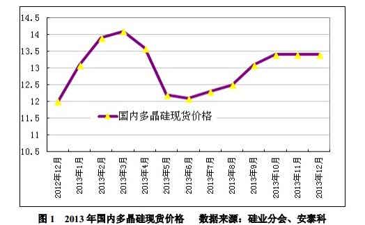 一、企業(yè)紛紛復(fù)產(chǎn)。受我國(guó)對(duì)美韓“雙反”初裁利好,到2013年底,國(guó)內(nèi)大約有13家多晶硅企業(yè)恢復(fù)生產(chǎn),國(guó)內(nèi)開工率達(dá)30%以上。二、國(guó)外傾銷依舊。2013年1-11月我國(guó)進(jìn)口多晶硅量累計(jì)達(dá)7.2萬(wàn)噸,預(yù)計(jì)全年進(jìn)口量達(dá)7.9萬(wàn)噸。進(jìn)口均價(jià)方面,2013年1-11月我國(guó)多晶硅進(jìn)口均價(jià)為18.71美元/千克,同比下滑27.4%。可見國(guó)外傾銷依舊持續(xù)。三、價(jià)格低位徘徊。受國(guó)外傾銷影響,全國(guó)內(nèi)多晶硅現(xiàn)貨交易均價(jià)降至13萬(wàn)元/噸,同比下滑16.7%。四、下游需求向好。國(guó)內(nèi)光伏配套政策陸續(xù)出臺(tái),國(guó)內(nèi)光伏市場(chǎng)規(guī)模逐步啟動(dòng),預(yù)計(jì)全年光伏安裝量在9GW左右。