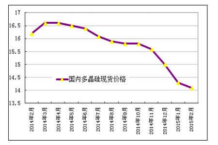 2015年1-2月份我國多晶硅價格緩慢微幅下滑,從1月初的14.44萬元/噸下滑到2月中旬的14.09萬元/噸,降幅為2.4%,進入春節后,受假期人員調休及物流等因素影響,多晶硅料少有成交,14.09萬元/噸的價格一直維持到2月底。