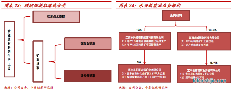 依托國(guó)內(nèi)自有礦山、走鋰云母提鋰道路:碳酸鋰生產(chǎn)工藝主要包括鹽湖提鋰以及礦石提鋰,目前國(guó)內(nèi)多采用固體礦石提取工藝,具體又分為鋰輝石提鋰和鋰云母提鋰。鋰輝石中的鋰含量通常高于鋰云母,更適合用于生產(chǎn)含鋰原材料。但是,鋰輝石礦在國(guó)內(nèi)的資源量少,主要依賴(lài)于從澳大利亞等地區(qū)進(jìn)口,運(yùn)輸成本高,供應(yīng)保障穩(wěn)定性相對(duì)不足,致使電池級(jí)碳酸鋰生產(chǎn)成本居高難下。為了保證原材料最大程度的可控,永興依托收購(gòu)的國(guó)內(nèi)礦產(chǎn)資源,堅(jiān)定走鋰云母提鋰道路。目前公司已經(jīng)擁有兩大礦業(yè)公司-花橋礦業(yè)和花鋰礦業(yè),礦區(qū)地處江西宜春,素有“亞洲鋰都”之稱(chēng),探明鋰云母氧化鋰總儲(chǔ)量約250萬(wàn)噸, 占全國(guó)氧化鋰資源的15.2%,占全國(guó)礦山鋰資源的62.1%。永拓和花鋰礦業(yè)最新原礦探明儲(chǔ)量分別達(dá)到4500萬(wàn)噸及600萬(wàn)噸,年選礦能力120萬(wàn)噸、50萬(wàn)噸。兩大礦業(yè)公司的存在,為公司碳酸鋰業(yè)務(wù)的發(fā)展打下了堅(jiān)實(shí)基礎(chǔ);