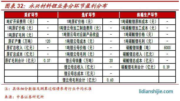 碳酸鋰業(yè)績(jī)測(cè)算:對(duì)于公司碳酸鋰業(yè)務(wù)的測(cè)算,由于公司已經(jīng)實(shí)現(xiàn)全產(chǎn)業(yè)鏈布局,采礦-選礦-終端產(chǎn)品三個(gè)環(huán)節(jié)都會(huì)產(chǎn)生相應(yīng)利潤(rùn),目前而言,伴隨著碳酸鋰價(jià)格快速下跌,越靠近終端其盈利壓力越大,反而是上游的礦石采掘和篩選環(huán)節(jié)利潤(rùn)更為豐厚,因此為了詳細(xì)拆分公司鋰產(chǎn)品盈利分布,我們將各環(huán)節(jié)分開(kāi)測(cè)算。1)采礦:公司目前擁有花橋、花鋰礦業(yè)兩大礦業(yè)公司,按照原礦年產(chǎn)量120萬(wàn)噸測(cè)算,貢獻(xiàn)毛利0.37億元,值得注意的公司分別持有花橋、花鋰公司70%、45.85%股權(quán),對(duì)應(yīng)上市公司業(yè)績(jī)應(yīng)當(dāng)乘以相應(yīng)比例;2)選礦:永興新能源與永誠(chéng)鋰業(yè)分別擁有120萬(wàn)噸及50萬(wàn)噸選礦能力,以6:1的選礦能力采選出精礦(鋰云母),按照20萬(wàn)噸鋰云母產(chǎn)量測(cè)算,其貢獻(xiàn)毛利0.6億元;3)碳酸鋰:按照碳酸鋰價(jià)格54000元,全年銷(xiāo)量8000噸測(cè)算,貢獻(xiàn)毛利0.39億元,綜上統(tǒng)計(jì),公司鋰產(chǎn)品有望貢獻(xiàn)毛利1.25億元;