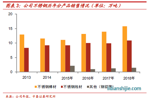 產(chǎn)能與產(chǎn)品結(jié)構(gòu):公司目前具有35萬(wàn)噸不銹鋼和鎳基合金煉鋼產(chǎn)能,其中煉鋼一廠(chǎng)電爐30t年產(chǎn)能10萬(wàn)噸(之前受到生產(chǎn)工藝限制,實(shí)際產(chǎn)量只有6-7萬(wàn)噸,經(jīng)過(guò)2019年的技改之后,未來(lái)公司實(shí)際產(chǎn)量將接近滿(mǎn)產(chǎn)狀態(tài)),煉鋼二廠(chǎng)電爐50t年產(chǎn)能25萬(wàn)噸。從軋材環(huán)節(jié)而言,公司線(xiàn)材、大盤(pán)卷以及棒材產(chǎn)能共計(jì)25萬(wàn)噸,剩余5萬(wàn)噸鍛打產(chǎn)線(xiàn)、鋼錠銷(xiāo)售2萬(wàn)噸、委外鍛打2萬(wàn)噸。通過(guò)近幾年產(chǎn)線(xiàn)的不斷調(diào)整和升級(jí),公司目前煉鋼與軋材環(huán)節(jié)實(shí)現(xiàn)基本匹配,隨著煉鋼一廠(chǎng)實(shí)現(xiàn)完全達(dá)產(chǎn),后期產(chǎn)銷(xiāo)量仍有提升空間;