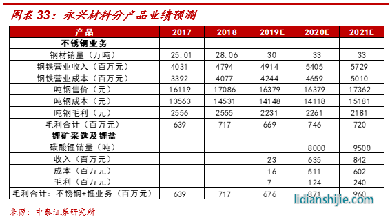 重要假設(shè):(1)不銹鋼銷(xiāo)量2019-2021年分別達(dá)到30萬(wàn)噸、33萬(wàn)噸、33萬(wàn)噸;(2)2020年碳酸鋰均價(jià)54000元,2021年碳酸鋰均價(jià)上行至64800元;(3)2020-2021年公司碳酸鋰銷(xiāo)量分別達(dá)到8000噸、9500噸水平;