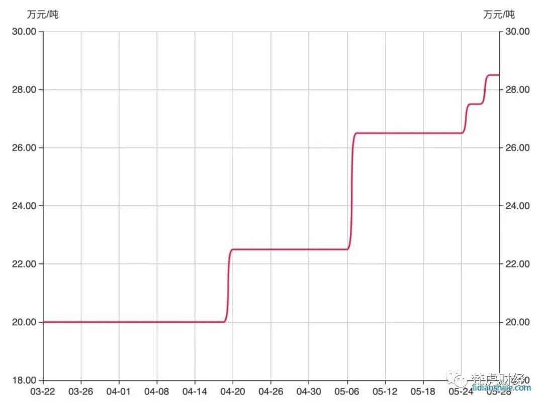 作為鋰電池電解液的關(guān)鍵材料,去年下半年以來,六氟磷酸鋰價(jià)格重心不斷上移。數(shù)據(jù)顯示,截至5月28日,六氟磷酸鋰報(bào)價(jià)為28.5萬元/噸,近兩個(gè)月累計(jì)上漲超42%。