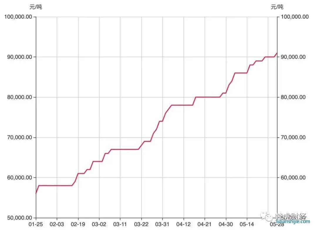 鋰電池全產(chǎn)業(yè)鏈的火爆,也為上游原材料提供強(qiáng)勁的價(jià)格上漲動(dòng)力。例如,作為高鎳三元鋰電池的關(guān)鍵原材料,氫氧化鋰價(jià)格已連漲23周。數(shù)據(jù)顯示,截至5月28日,國產(chǎn)氫氧化鋰報(bào)價(jià)為9.1萬元/噸,今年以來累計(jì)漲幅達(dá)85%。