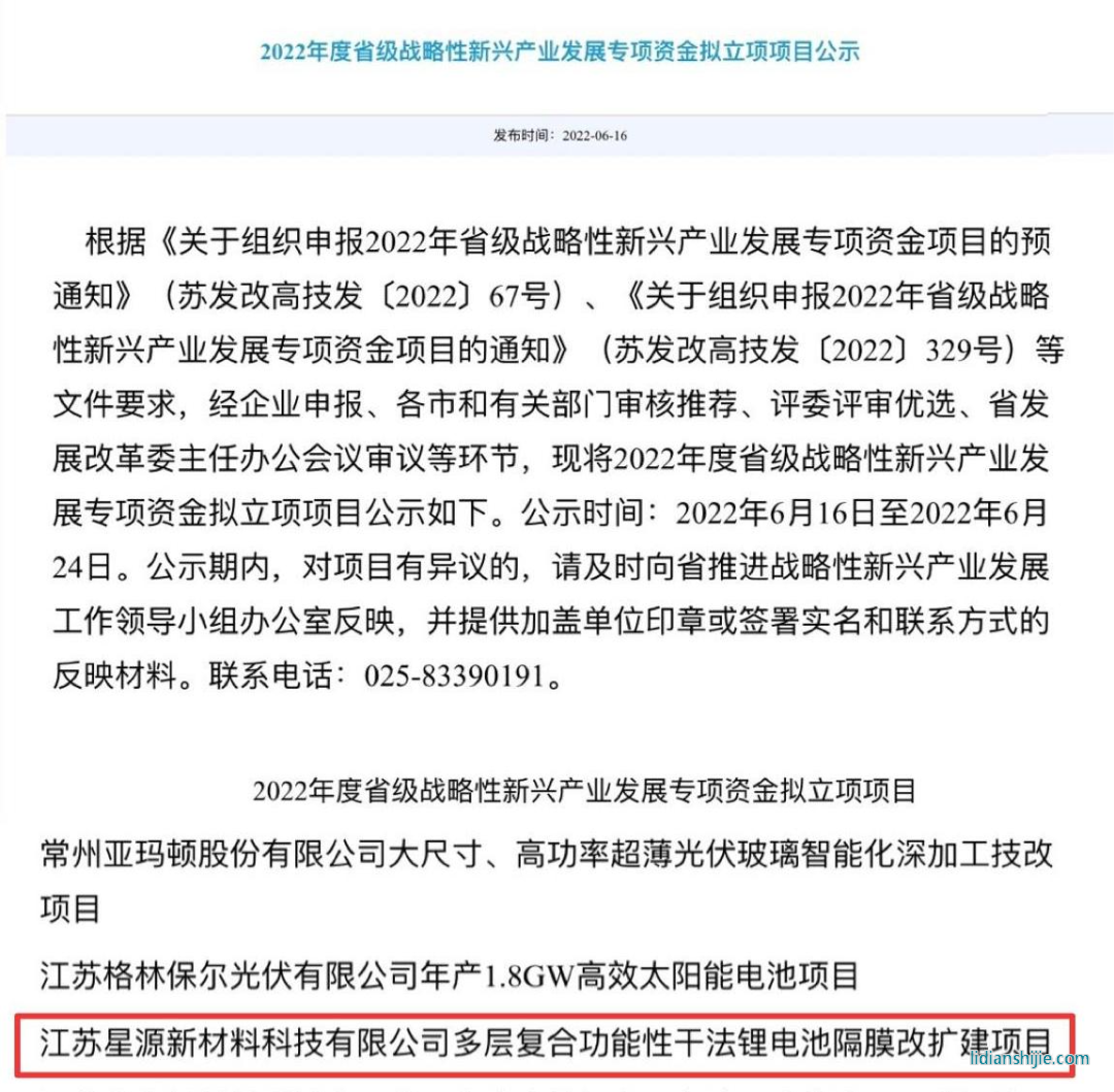 6月16日,星源材質(zhì)全資子公司江蘇星源“多層復(fù)合功能性干法鋰電池隔膜改擴(kuò)建項(xiàng)目”入選2022年度江蘇省戰(zhàn)略性新興產(chǎn)業(yè)發(fā)展專項(xiàng)資金擬立項(xiàng)項(xiàng)目,該項(xiàng)目將獲省級專項(xiàng)資金一千余萬元。
