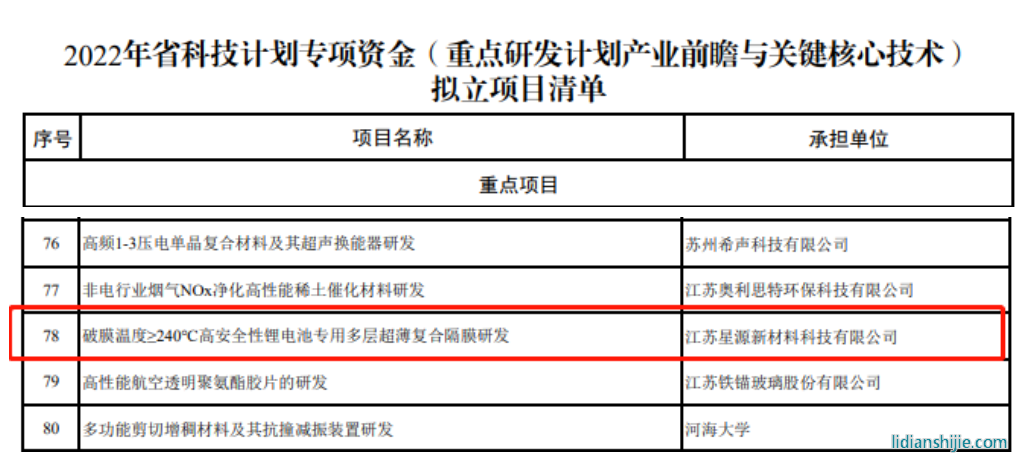 5月23日,江蘇省科技廳公示了2022年省科技計劃專項資金(重點研發計劃產業前瞻與關鍵核心技術)擬立項目,星源材質全資子公司江蘇星源的“破膜溫度≥240℃高安全性鋰電池專用多層超薄復合隔膜研發”項目位列其中!