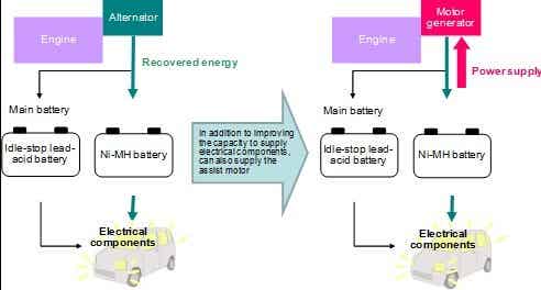 松下電器近期開發出一款鎳氫能量回收系統,這款系統專為配備啟停系統的汽車設計,其額定電壓為12V。車輛在制動過程中,產生的熱量將被轉化儲存在電池中,這些被儲存的能量將來則為汽車電氣系統提供電力,從而確保在發動機沒有運行時,電氣系統的正常供能。該系統同樣可以用來給輔助馬達提供電力驅動,以提高汽車燃油經濟性。