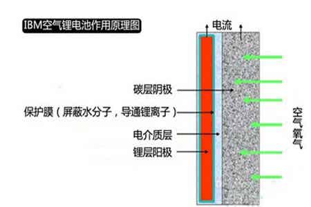 IBM空氣鋰電池的結(jié)構(gòu)如圖所示,陽極為鋰金屬板,陰極為表面碳層,中間有兩層電解質(zhì),其中靠近鋰金屬電板一側(cè)的電解質(zhì)負責(zé)接收由鋰金屬板釋放的鋰離子,而靠近碳層一側(cè)的電解質(zhì)則負責(zé)把接收到的鋰離子更好地滲透至碳層。兩種電解質(zhì)中間有阻擋膜,用以阻止不同層面物質(zhì)之間的相互滲透與污染。