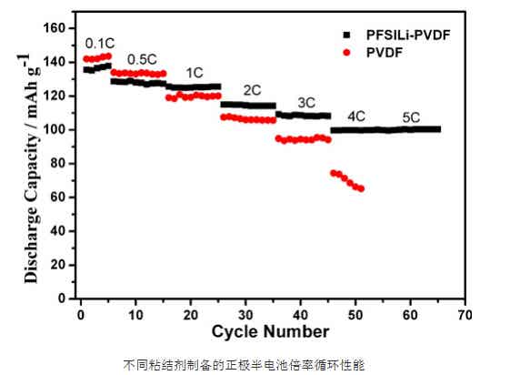 近年來(lái),中國(guó)科學(xué)院寧波材料技術(shù)與工程研究所研究員薛立新領(lǐng)導(dǎo)的高分子功能膜團(tuán)隊(duì)在鋰離子電池粘結(jié)劑方面取得一系列的進(jìn)展,合成了具有含氟磺酰亞胺主鏈以及具有全氟磺酸側(cè)鏈的離子聚合物,以其作為鋰電池粘結(jié)劑的極片具有良好的電化學(xué)穩(wěn)定性,與使用PVDF粘結(jié)劑的極片相比,體現(xiàn)出更小的峰電位差,表明含有導(dǎo)電粘結(jié)劑的極片內(nèi)部脫鋰/嵌鋰氧化還原反應(yīng)可逆性更好,極化更小。