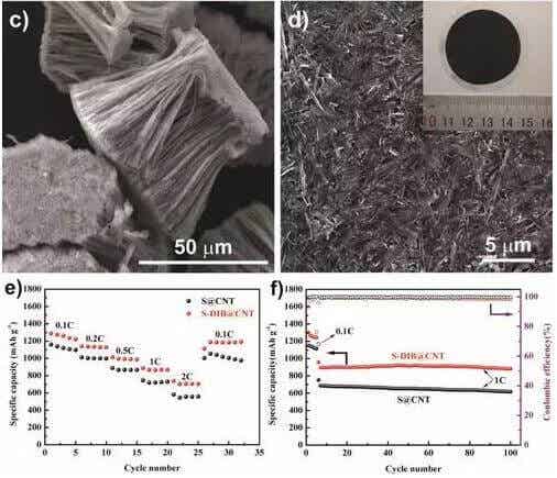 圖1 有機硫聚合物(a) 和有機硫聚合物/碳納米管復合材料(b)的合成示意圖;有機硫聚合物/碳納米管復合材料(c)和膜電極(d)的掃描電鏡照片;物理和化學雙重限制的有機硫聚合物/碳納米管與單一物理限制的硫/碳納米管復合材料的倍率性能 (e)和循環性能(f)對比。