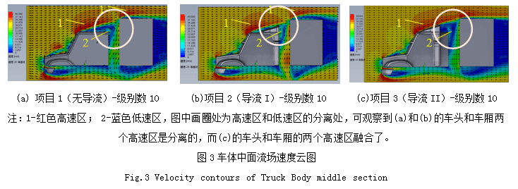 圖3是車體在流場中的速度分布云圖(取中面),對比三個項目,可清晰觀察到:項目1和項目2在車頭與車廂之間形成的兩個高速區組成的流線區是分離的,而項目3的兩個高速區組成的流線區幾乎是融合的。另外,云圖的顏色從藍至紅,表示空氣流速不斷增高,因此紅色區為高速區,而藍色區為低速區,速度發生驟變的區域稱為分離區。從圖可看到,車頭上方形成的氣流高低速分離區的形狀,無導流罩時,駕駛室上方的流體流線軌跡形成明顯的高速與低速的分離帶,項目2導流罩由于沒有完全占據高速與低速的分離帶,仍不符合流線軌跡,因此項目2的兩個高速區仍是分離狀態,項目3導流罩幾乎完全占據了高速與低速的分離帶,外形從設計上也幾乎符合了流線軌跡,因此,項目3的兩個高速區幾乎融合在一起。